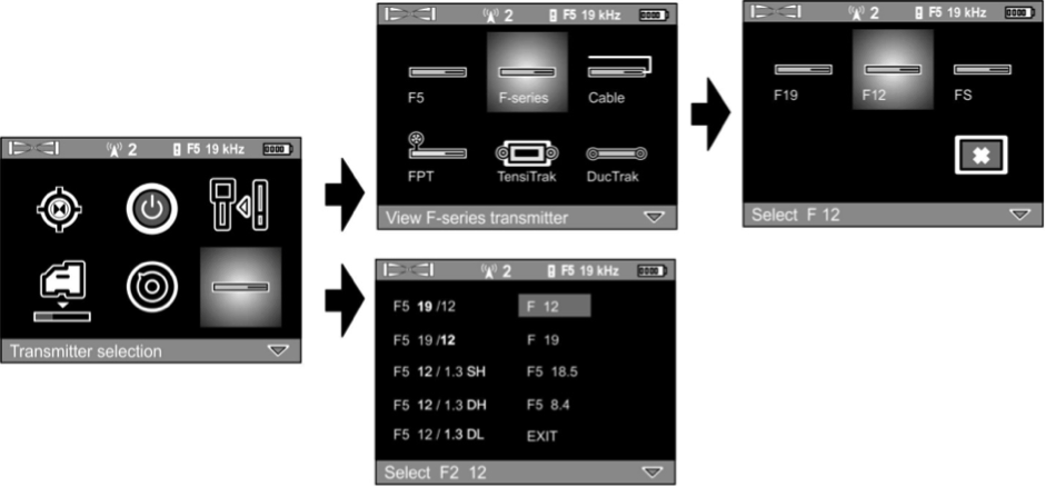 W „starych” lokalizacjach natychmiast przechodzisz do podmenu bezpośredniego wyboru nadajnika, zawierającego całą różnorodność nadajników, które mogą współpracować z tą lokalizacją. Użyj przełącznika, aby wybrać nadajnik „F19” lub „F12”. Naciśnij i przytrzymaj przycisk, aż usłyszysz sygnał i przejdź do menu głównego opcji lokalizacji. Na przykład poniższy rysunek przedstawia sekwencję ruchów, aby wybrać tryb pracy dla nadajnika FX12 (FXL12) — (12 kHz).
