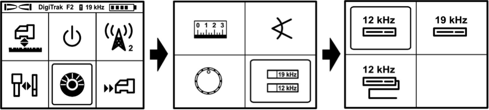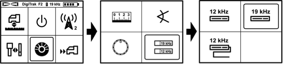 W przypadku „nowej” lokalizacji dwuczęstotliwościowej F2 ustaw częstotliwość roboczą 12 kHz klikając przycisk na ikonie „prędkościomierza”, a następnie naciskając i przytrzymując przycisk przejdź do kolejnej strony menu i wybierz, klikając kilkakrotnie prawą ikonę przedstawiającą nadajniki „12kHz” i „19 kHz” u dołu ekranu. Ponownie, naciskając i przytrzymując przycisk, przejdź do menu z listą dostępnych nadajników. Po wybraniu przez wielokrotne kliknięcie ikony z nadajnikiem „19 kHz” (prawy górny róg), naciśnij i przytrzymaj przycisk, aby wybrać tryb pracy nadajnika FX19 na baterie.