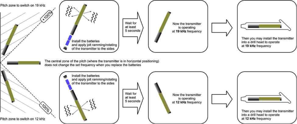 Na przykład, aby wybrać częstotliwość 19kHz (art. 1-4), należy włożyć baterie od dołu, gdy głowica nadajnika jest skierowana w górę. Po 3-4 sekundach widać wzrost poziomu sygnału na wyświetlaczu lokalizacji, po czym można przeprowadzić wszystkie procedury instalacji nadajnika wraz z głowicą wiercącą oraz kalibrację systemu.